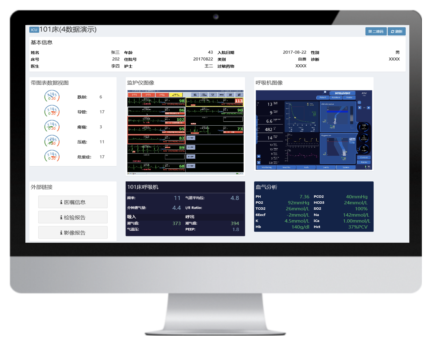 實(shí)時呈現(xiàn)病人體征參數(shù)、變化趨勢,診療設(shè)備參數(shù),同時接入醫(yī)囑、檢驗結(jié)果數(shù)據(jù),一體化呈現(xiàn)存儲和回溯,方便醫(yī)護(hù)急救、會診、查房